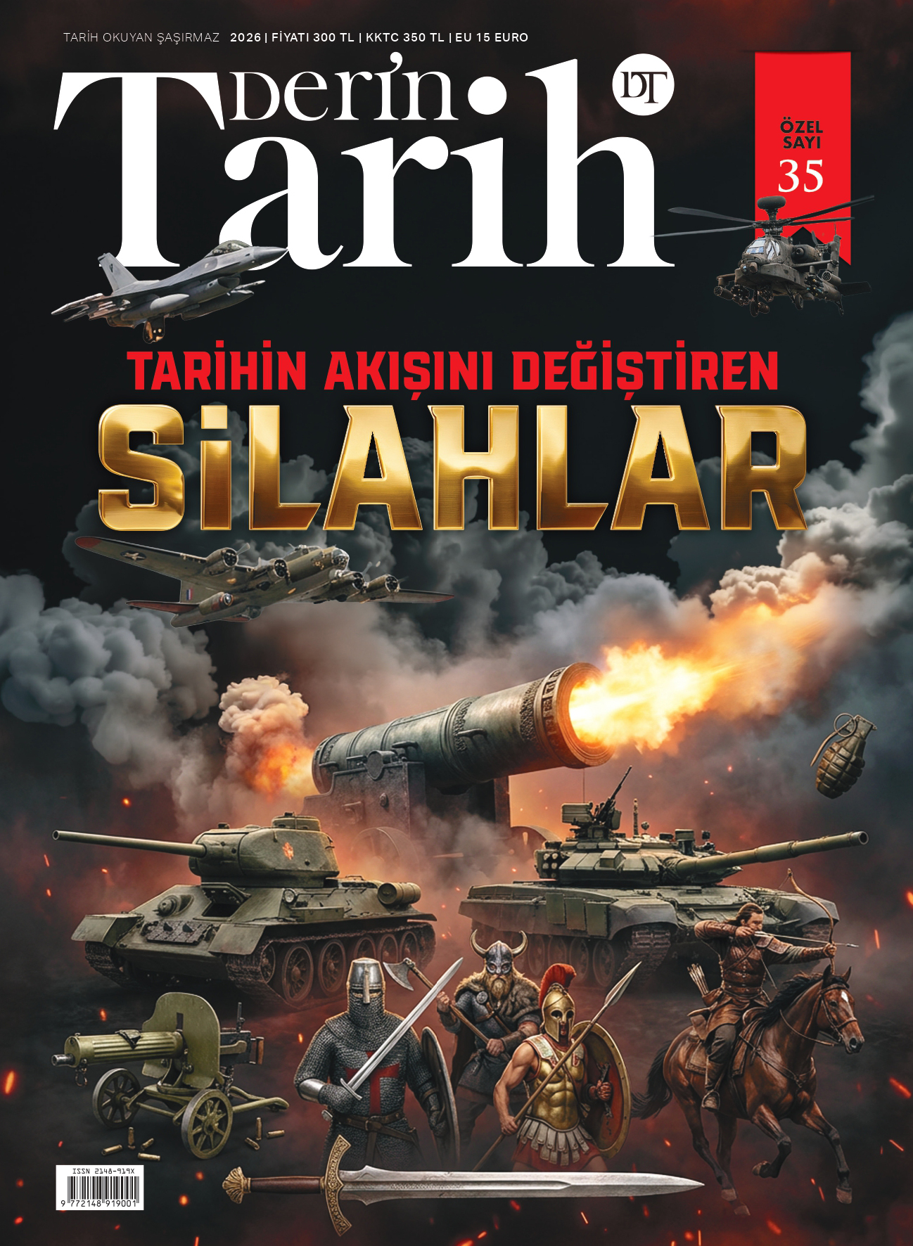 Derin Tarih olarak, 35’inci özel sayımızda, sıra dışı bir dosyayla karşınızdayız: İnsanlık tarihinin ilk dönemlerinden itibaren, tarihin akışını değiştiren, savaşlarda dengeleri yerinden oynatan ve çığır açan silahları -dolayısıyla zaman içinde savaş yöntemlerinin nasıl gelişip dönüştüğünü- mercek altına alıyoruz. Tekerleğin icadıyla birlikte tasarlanan tekerlekli savaş arabalarından ok, mızrak ve kalkana… Türk eğri kılıcından çeşitli boyutlardaki savaş gemilerine… Hâlâ bugün bile büyük merak uyandıran Rum ateşinden mancınığa… Barut ve toptan tüm çeşitleriyle tüfeğe ve ateşli silahlara… Mayından zırhlı araçlara ve denizaltılara… Savaş uçakları ve füzelerden roketlere, nihayet insansız hava araçlarına… Nükleer silahlardan laboratuvar ortamında üretilen biyolojik saldırı yöntemlerine… Dosyamızın içeriğinin, arşivinizin en kıymetli parçaları arasına katılacağından şüphemiz yok.